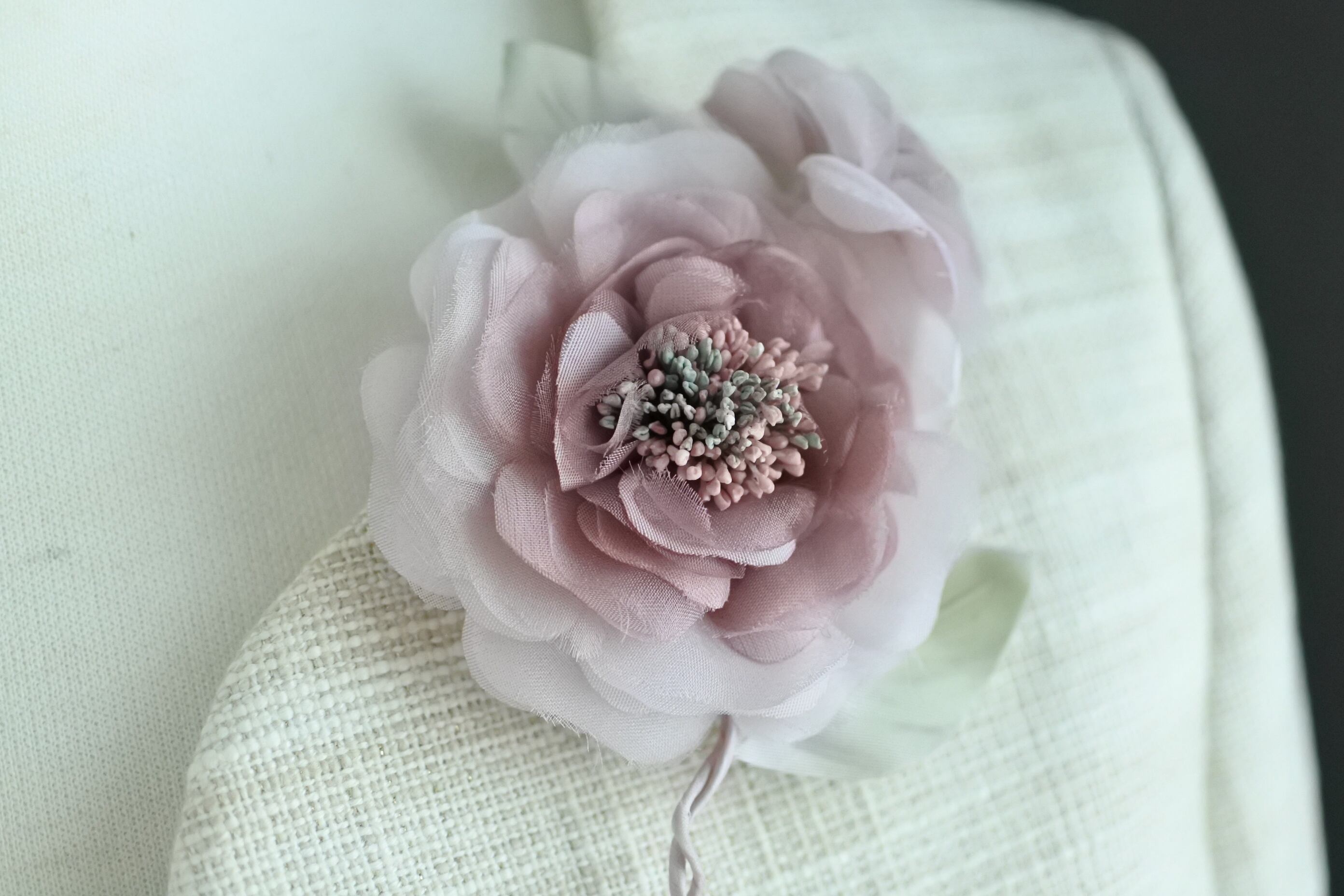 せっかく出会えたお気に入りのコサージュ。ハレの日当日だけでなく、もっと出番があってもいいのでは?その大切な日が来るまで、そのコサージュを眺めながらワクワクするような時間も楽しんで頂きたい・・・飾れて、香るコサージュを「サシェ(匂い袋)」という形でお作りしました。