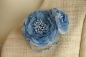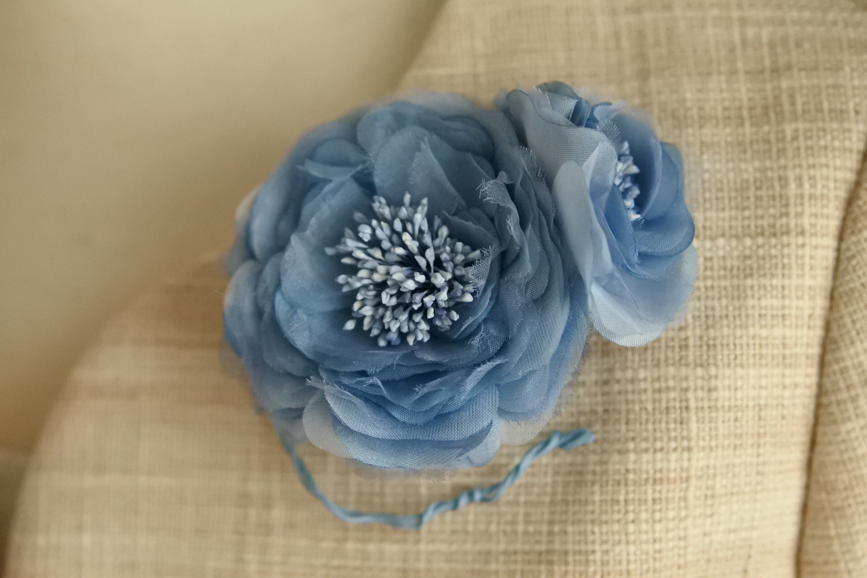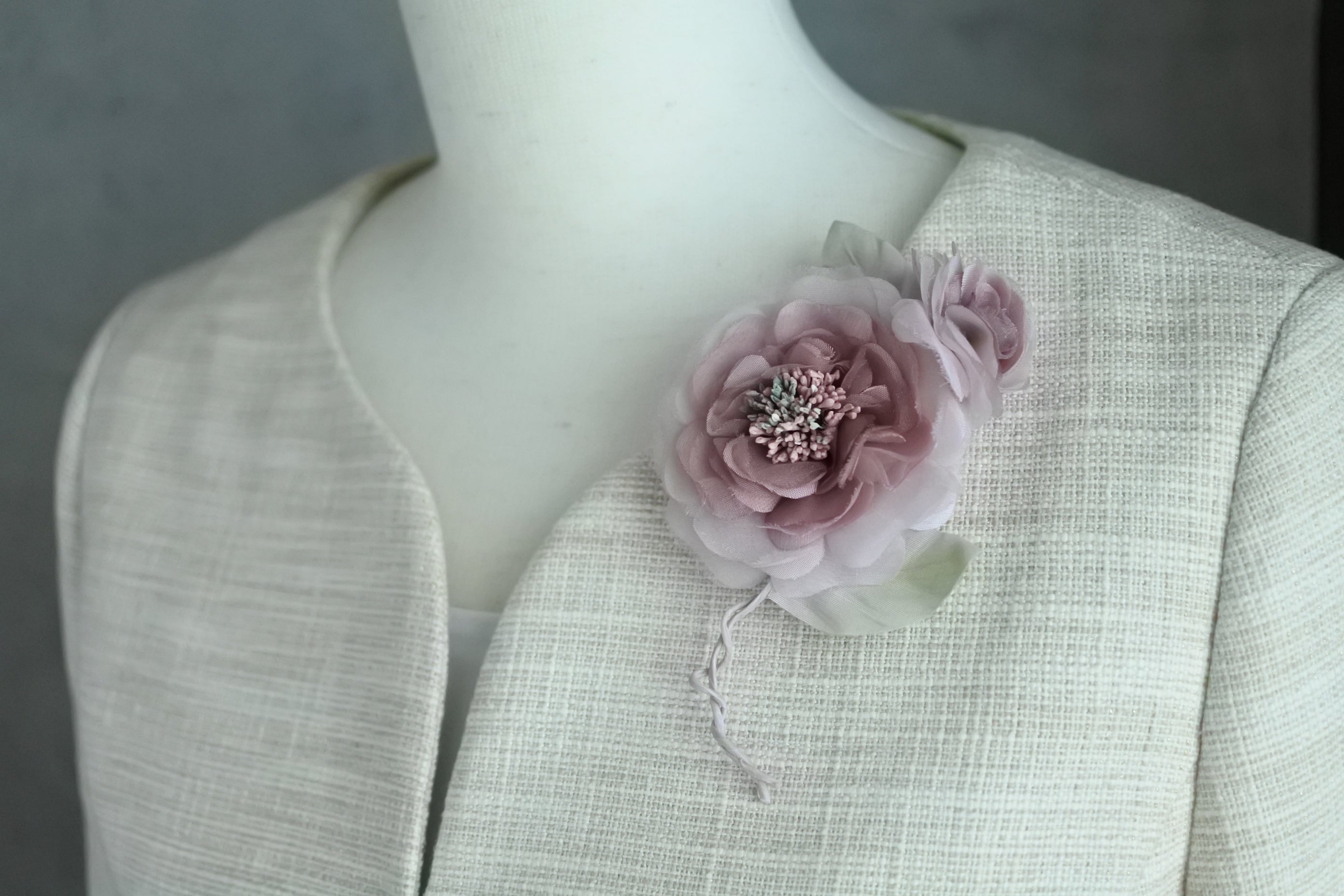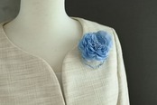 コサージュはバラのモチーフ(右上、右下)です。落ち着いたピンクとブルーに染めた生地(レーヨン)にシルクオーガンジーをはさみ、ふんわりと柔らかい印象に仕上げました。