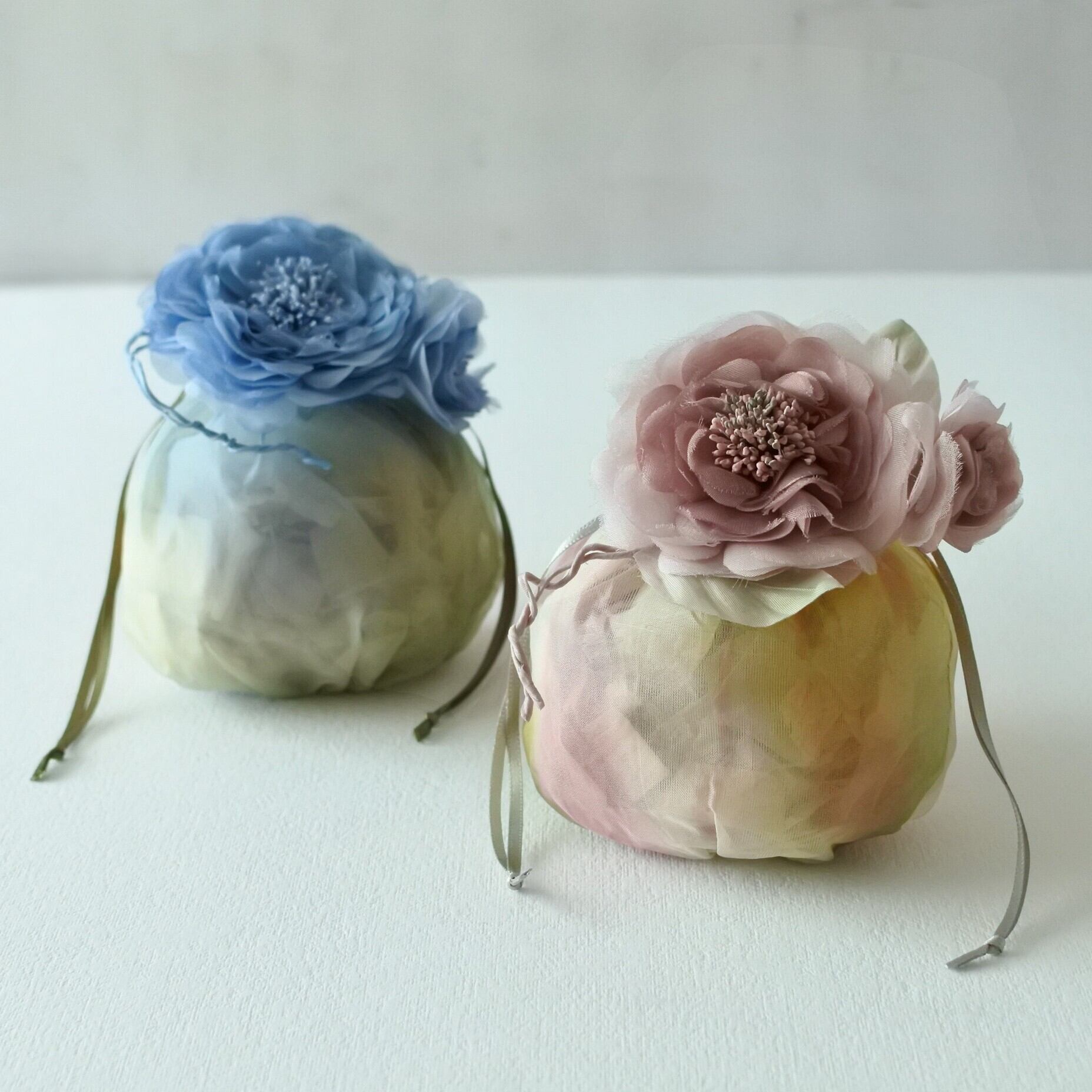 サシェの巾着も、レーヨンのオーガンジーをコサージュの色に合わせて染めています。