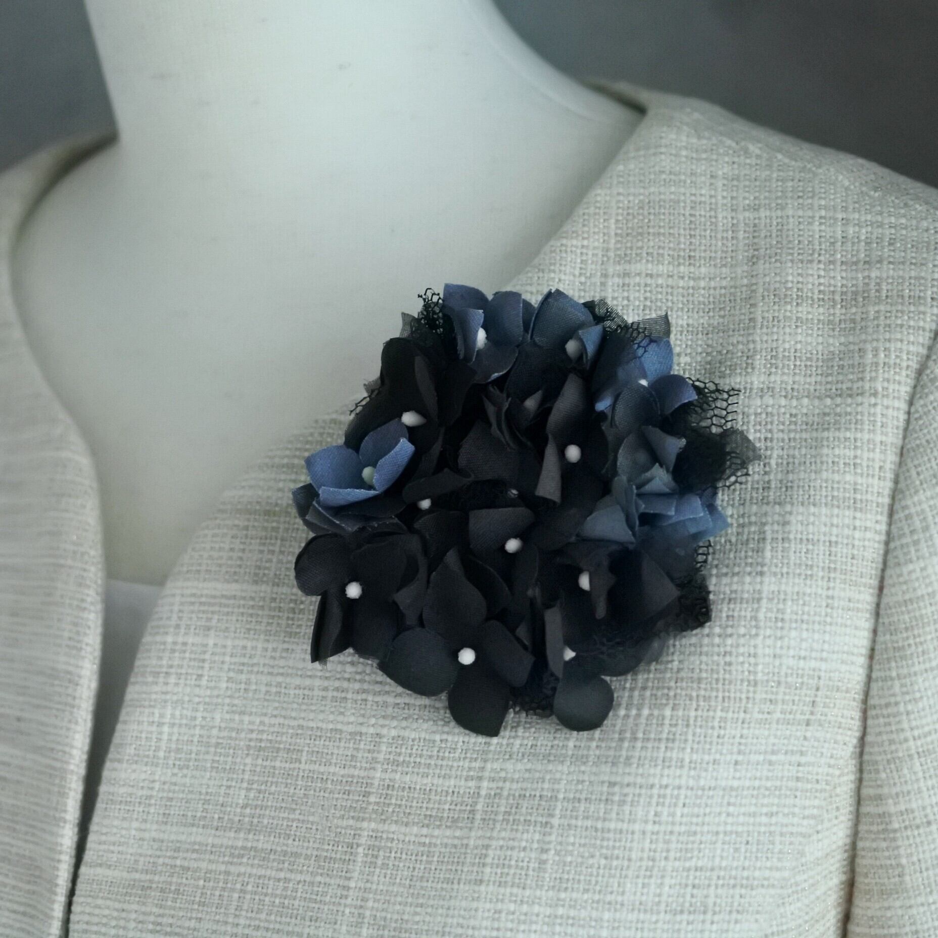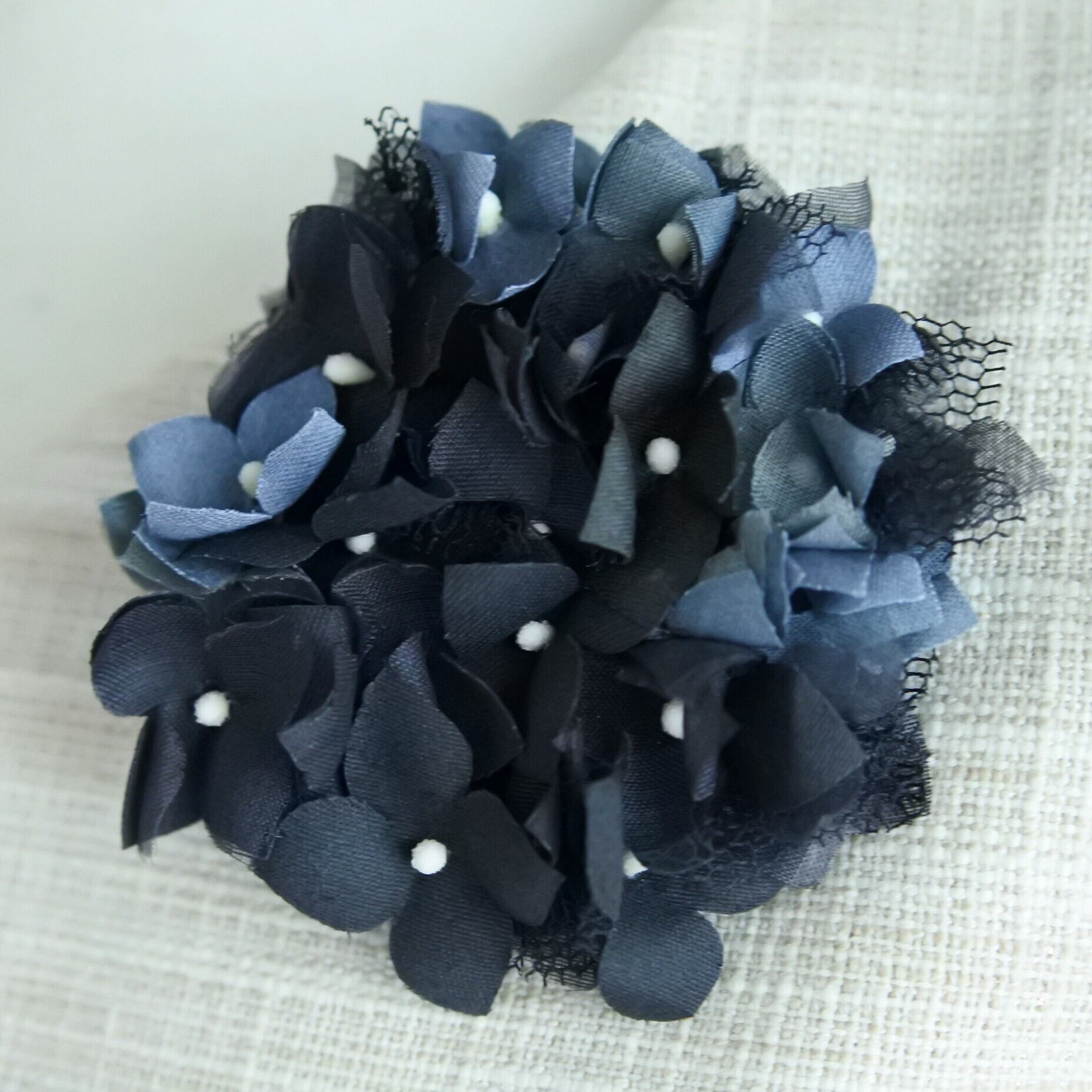 小さい花が集まて丸を描くアジサイ。短い梅雨時だけでなく、いつでも使える色として黒に染めました。生地はやや厚みのある綿サテンを主に使用しています。洋服などに合わせやすいように黒だけではなくグレーをまぜ、チュールを入れ込んでいます。