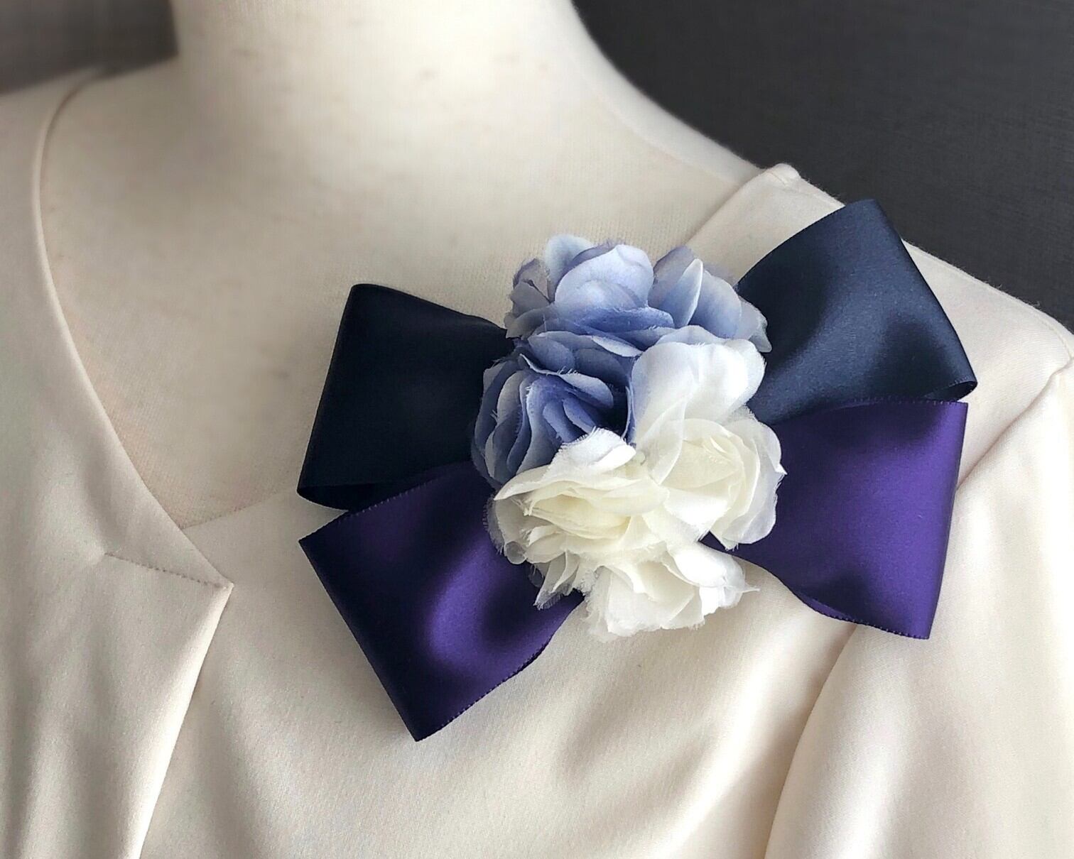 エレガントな雰囲気で、セレモニーなどのイベントでもお使い頂けるコサージュです。リボンは上質なサテンリボンを使用していますので、落ち着いた光沢感と柔らかい質感が魅力的です。