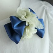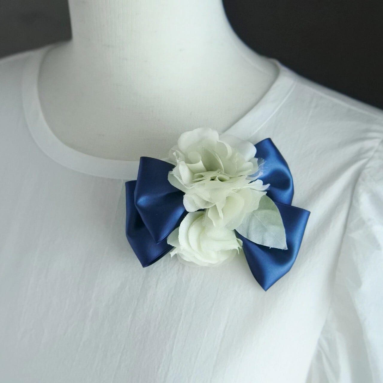 花にはシルク(羽二重、オーガンジー)をたっぷり使い、上質なサテンリボンにのせた品のあるコサージュです。セレモニーなどハレの日におすすめです。