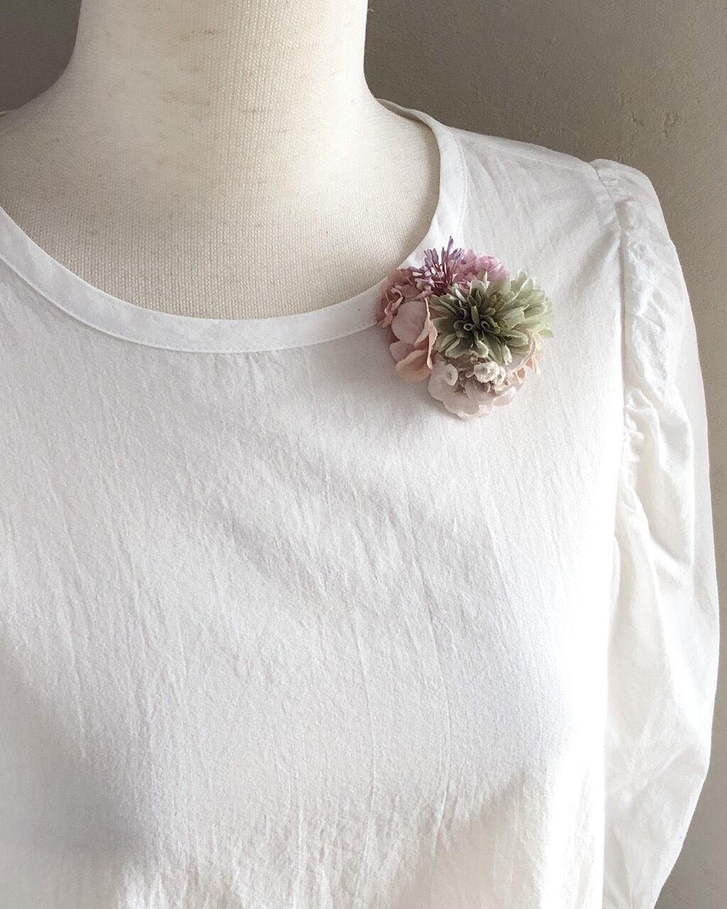 種類のちがうコットンを混ぜた表情豊かなお花をぎゅっと纏めました。柔らかい雰囲気で、いつものコーディネートをやさしく、華やかに飾ってくれそうです。